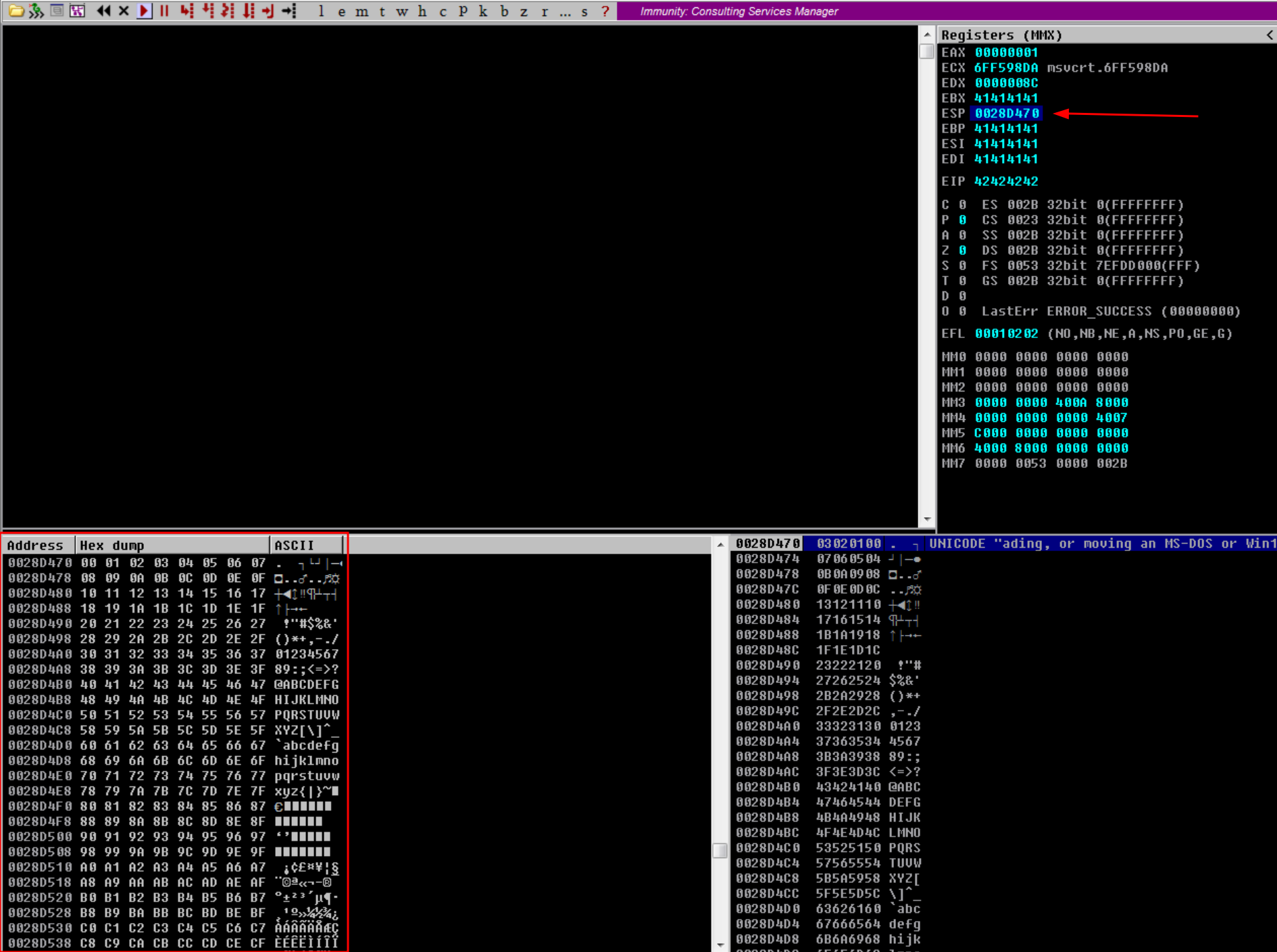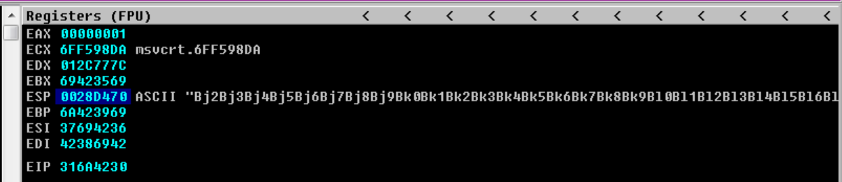 From above scenario, we used only AAAA which is repetitive data to overflow the program. The problem is that it doesn’t help us to locate the exact point of overflow, as we can’t distinguish one “A” from another in the memory dump.