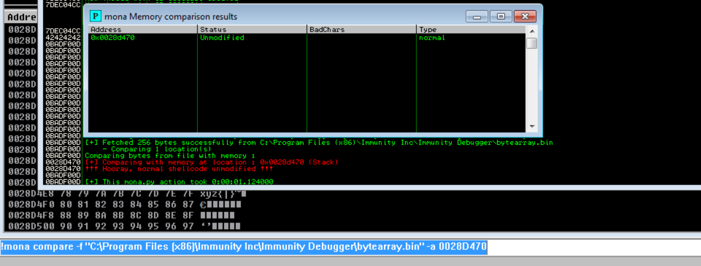 Now we can see our ESP is overwritten by junk data, value is 0028D470. Right click on it and Follow in Dump to see in the dump window. We can also check manually but in this case we gonna use mona command which is !mona compare -f "C:\Program Files (x86)\Immunity Inc\Immunity Debugger\bytearray.bin" -a 0028D470 for automate task. If we have bad charaters, it will show all in the BadChars field.