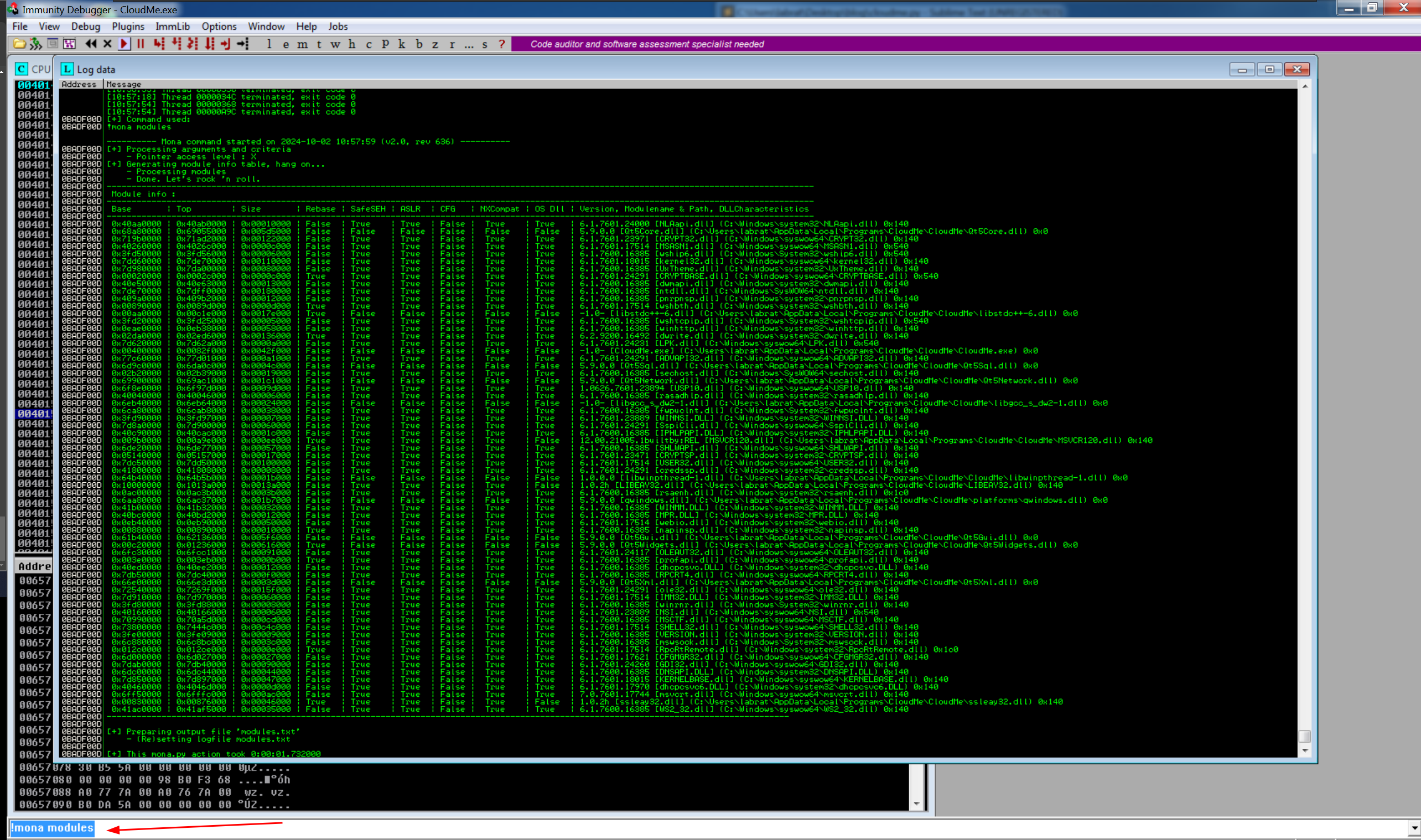 Let’s continue our exploit. Now we need to identity jump instruction in the modules dll or similar component cloueme.exe which are lack memory protection. We can use !mona modules command to accomplish this.