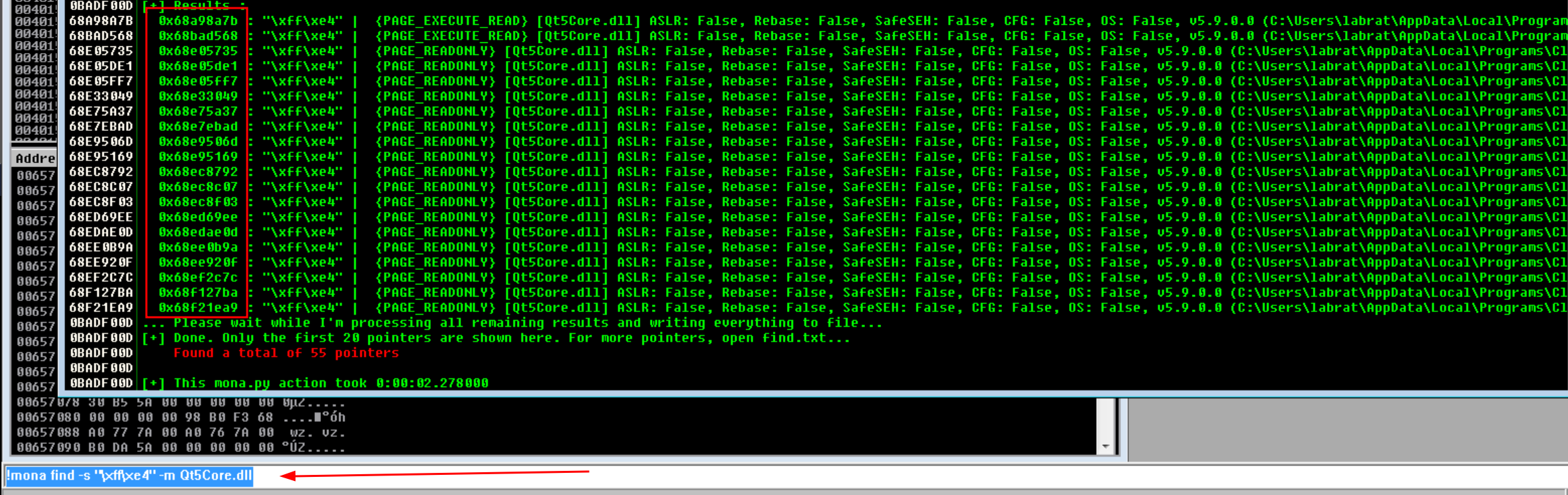 Okay the opcode for jmp esp is FF E4. Now let check this opcode is available or not inside our Qt5Core.dll using this command !mona find -s "\xff\xe4" -m Qt5Core.dll
