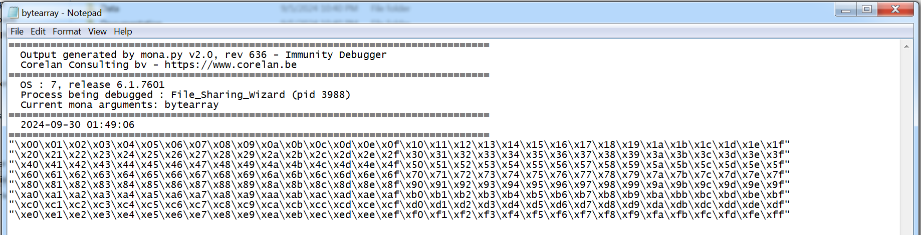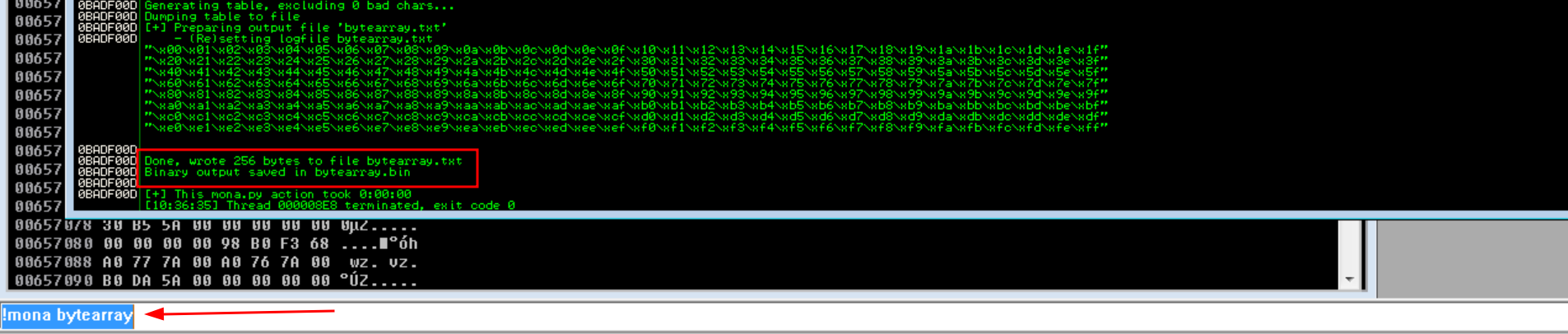 We can generate bad characters byte array using !mona bytearray command. It will store two file in current working directory, bytearray.txt and bytearray.bin . You can set mona’s current working directory with this command !mona config -set workingfolder c:\mona